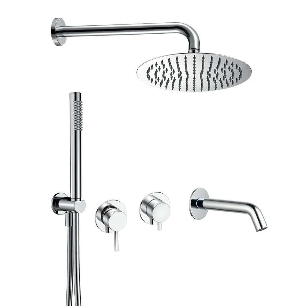 Система состоит из верхнего душа с кронштейном, ручного душа с шлангом, встраиваемого в стену смесителя с монтажной частью, излива, держателя для ручного душа.