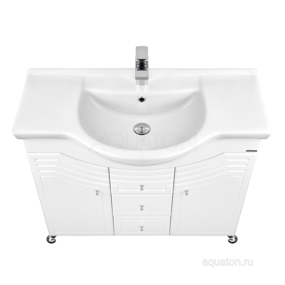 Большая удобная тумба Домус 95 от AQUATON выполнена в ретро стилистике из влагостойкой ЛДСП и МДФ и комплектуется раковиной сложной формы AQUATON Аквастоун 95. Вместительная модель в белом цвете предлагает удобную систему хранения: слева и справа за распашными фасадами находятся полки, а в центре сверху расположен откидной фасад с небольшой нишей, под которым находятся два удобных ящика. За счёт декоративной фрезеровки и хромированных ножек тумба смотрится лёгкой и изящной.