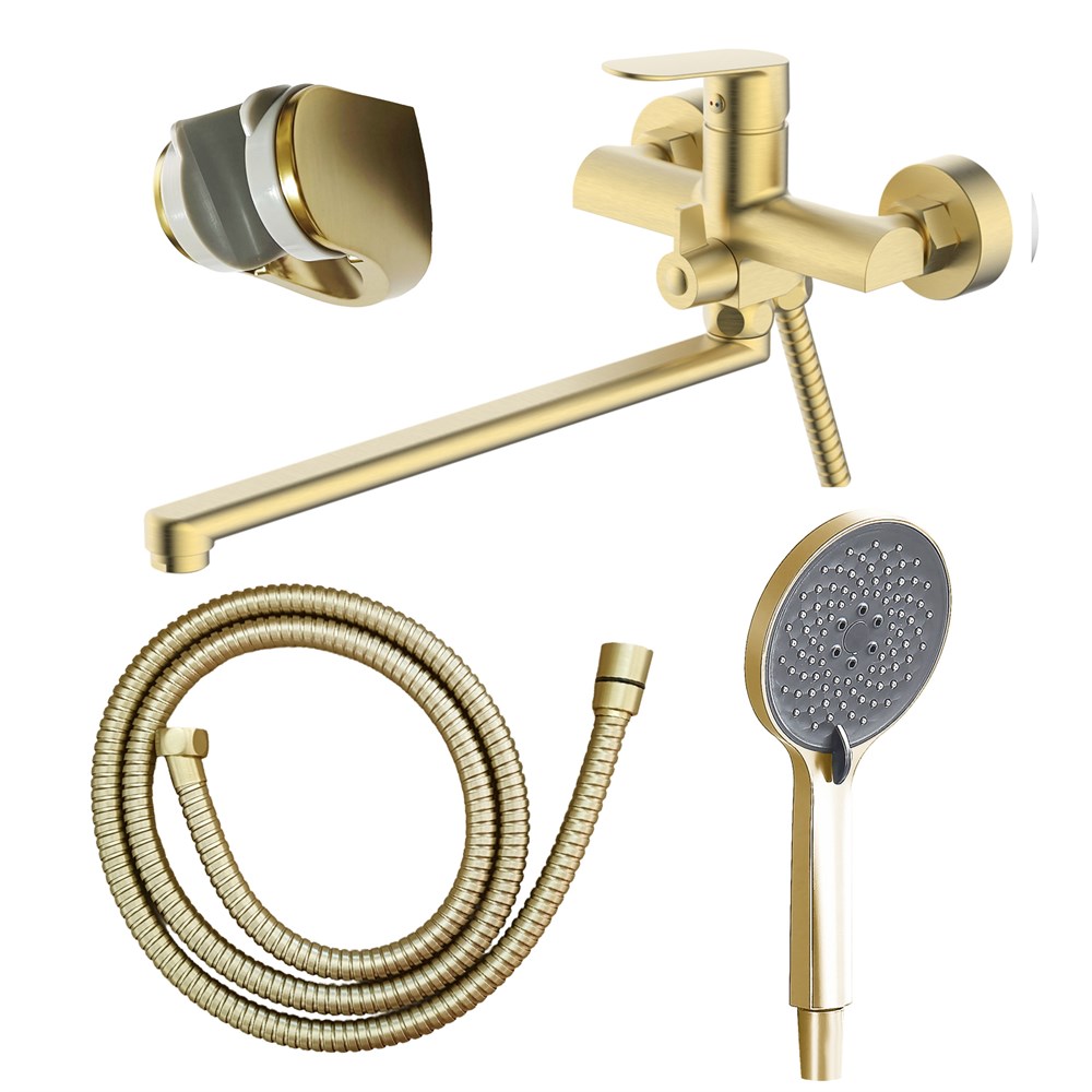 AZARIO Смеситель для ванны Alanti керамический картридж, длинный излив, с ручным душем, шланг 150 см, золото матовое (AZ-K1732MG)