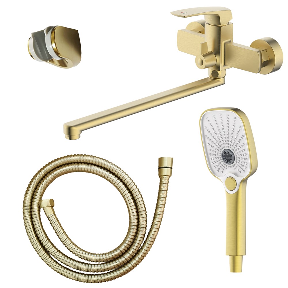 AZARIO Смеситель для ванны Conda керамический картридж, длинный излив, с ручным душем, шланг 150 см, золото матовое (AZ-K1711MG)
