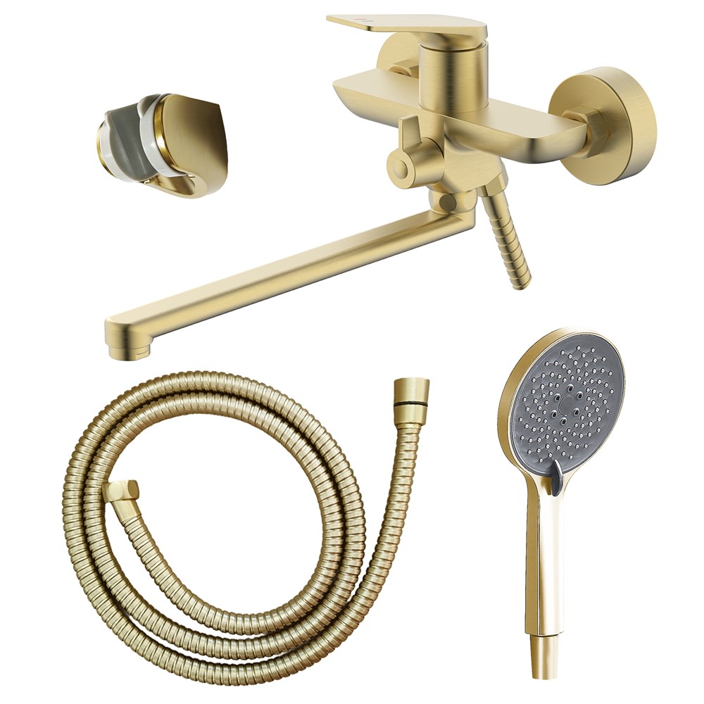 AZARIO Смеситель для ванны Lursy керамический картридж, длинный излив, с ручным душем, шланг 150 см, золото матовое (AZ-K1749MG)