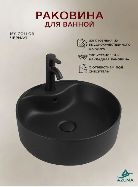 Раковина накладная Azuma My Collor 99603B черная матовая 410x410x150 Комплектация: раковина. Приимущества: раковина материал фарфор, более ровный покрытие в отличии от фаянса (без целюлита)