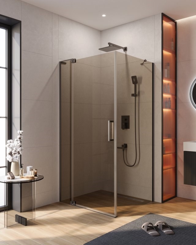 Серия Slider доступна к заказу с профилем в отделке хром и черный, брашированное золото, оружейная сталь. Исполнение стекла прозрачное, тонированное серое или бронзовое. Толщина закаленного стекла стекла 8 мм. Оригинальная надёжная конструкция петли Slider позволяет регулировать ширину входа душевого ограждения в диапазоне 10 см. Петли дверного полотна, выполнены из нержавеющей стали.