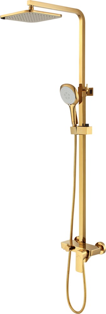 Функциональная душевая система в богатом золотом цвете с широкой лейкой, с эффектом настоящего тропического ливня. Штанга регулируется под любой рост.
