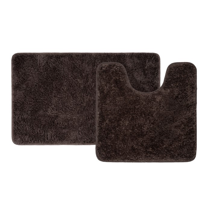 Набор из двух мягких ковриков для ванной темно-коричневого цвета с плотным высоким ворсом (2 см), очень приятных на ощупь. Стриженый ворс из микрофибры отлично держит форму, легко чистится и быстро сохнет. Коврики предназначены для ванной и для туалета (маленький коврик имеет вырез под унитаз).