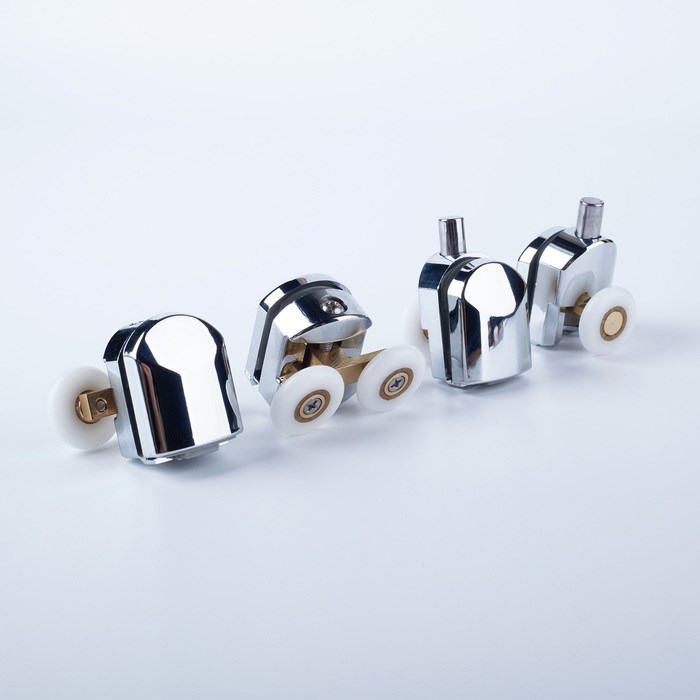Комплект роликов для раздвижных дверей душевой кабины или ограждения. Подходят для стекол толщиной 4 мм. Комплект из 4 штук (2 верхних и 2 нижних ролика).