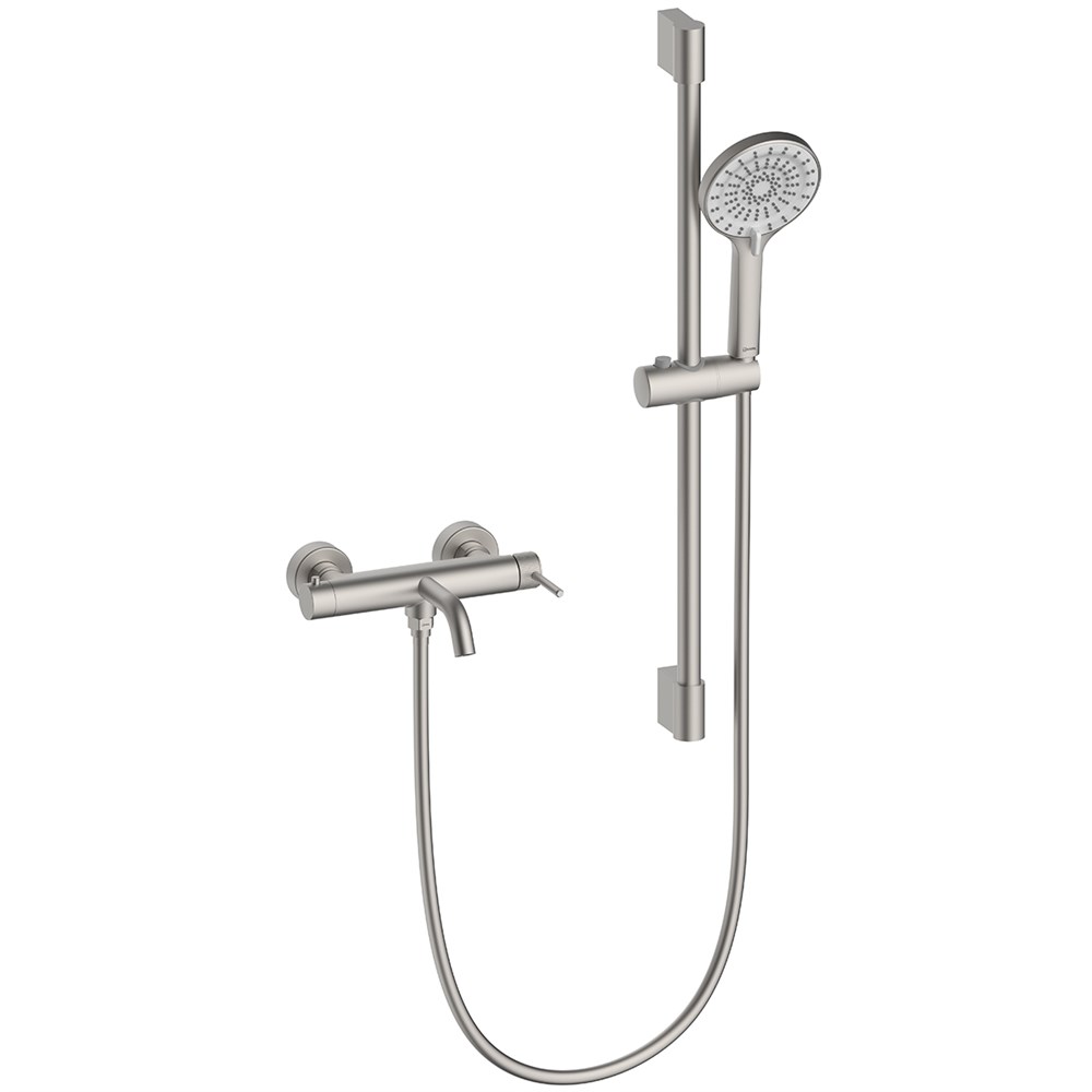 КомплектацияКорпус смесителя с монолитным изливом с аэратором, картриджем с керамическими пластинами, 2-позиционным картриджным переключателем с керамическими пластинами и металлической рукояткой, стойка для душа, держатель душевой лейки, 3-функциональная душевая лейка, душевой шланг 1,5 м, присоединительная группа для настенного крепления