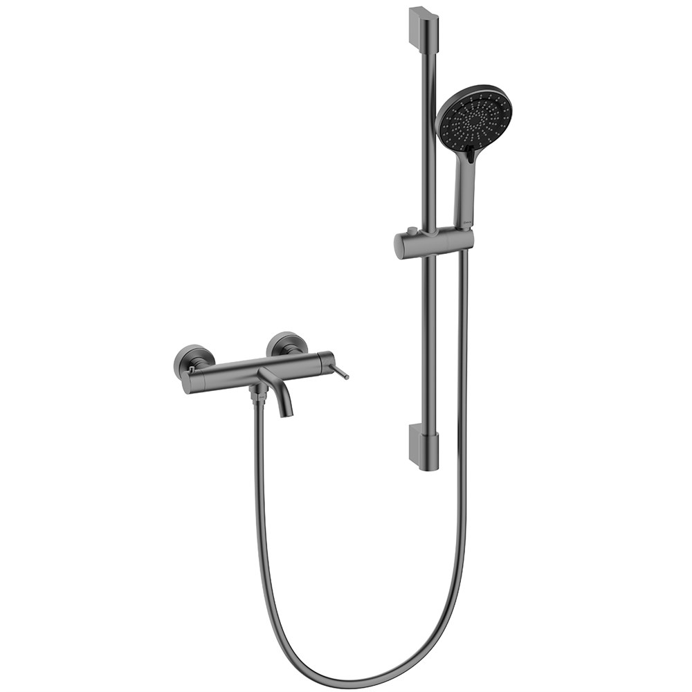 КомплектацияКорпус смесителя с монолитным изливом с аэратором, картриджем с керамическими пластинами, 2-позиционным картриджным переключателем с керамическими пластинами и металлической рукояткой, стойка для душа, держатель душевой лейки, 3-функциональная душевая лейка, душевой шланг 1,5 м, присоединительная группа для настенного крепления