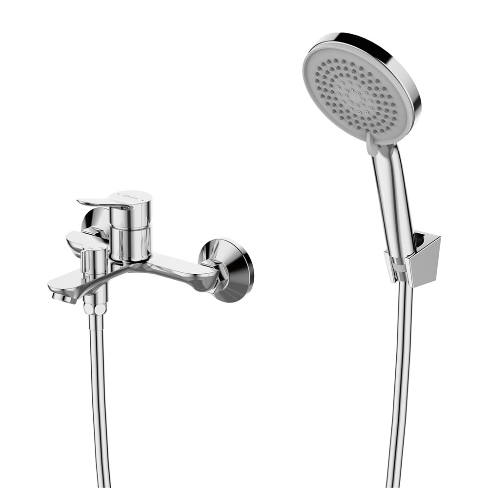 КомплектацияДержатель душевой лейки, присоединительная группа для настенного крепления, Корпус смесителя с монолитным изливом с аэратором, картриджем с керамическими пластинами, переключателем дивертором с керамическими пластинами и металлической рукояткой, Душевой шланг 1,5 м, 3-функциональная душевая лейка