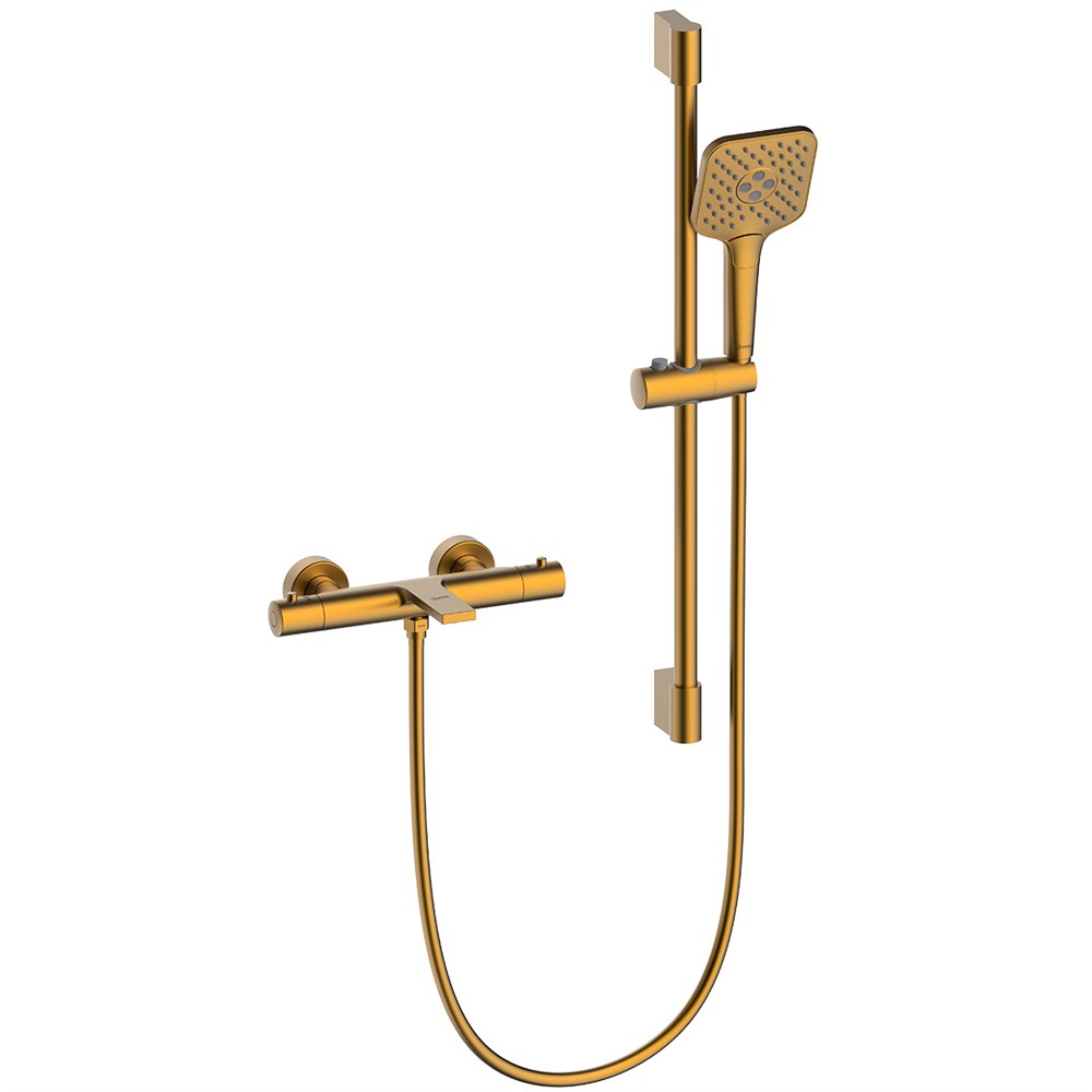 КомплектацияКорпус смесителя, излив с термостатическим картриджем, металлические рукоятки, стойка для душа, 3-функциональная лейка, душевой шланг 1,5 м, присоединительная группа для настенного крепления