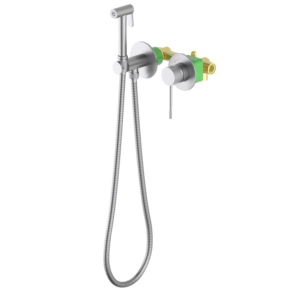 Встраиваемый смеситель с гигиеническим душем Timo Saona 2339 предназначен для монтажа в твердой или полой стене. Термокартридж с защитой от ожогов ограничивает максимальную температуру воды 45 С° повышая комфортность и безопасность использования. Основной задачей данной модели является: экономия места (установка чаши для биде занимает достаточно много места и к тому же затратнее). Все коммуникации, крепления и механизмы спрятаны в стену и закрыты декоративными накладками, снаружи находится только рычаг управления смесителем и держатель гигиенической лейки с подключеним шланга, такая модель отлично сочетается с инсталляцией для унитаза. Длины шланга 1,2 метра хватает для решения гигиенических задач. Можно также использовать например, для мытья собаки после прогулки или наполнения ведра воды и т.д. Сложностей монтажа не возникает при установке смесителя опытным сантехником. Внимательно изучите инструкцию по монтажу и эксплуатации.