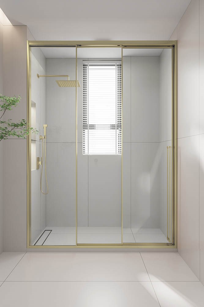 VECONI Душевая дверь раздвижная Premium Prato 300 G-L, 1000х2000, золото брашированный, стекло прозрачное