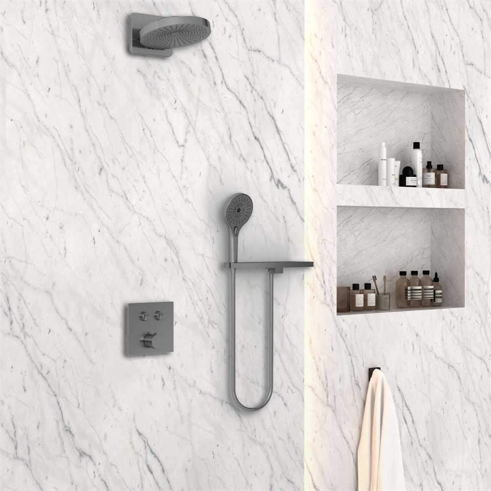Состав комплектаВерхний душ, полка с изливом и держателем ручного душа, ручной душ, смеситель со встраиваемой частью